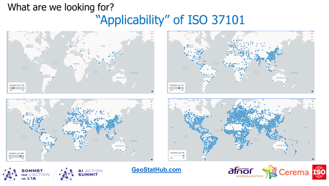 Cela signifie que la norme ISO 37101 doit être effectivement applicable à toutes les villes. Elle doit donc être aussi souple et simple que possible, ouverte aux solutions innovantes telles que l'utilisation de l'IA, mais non prescriptive afin de répondre à tous les besoins et défis de ces types de villes.