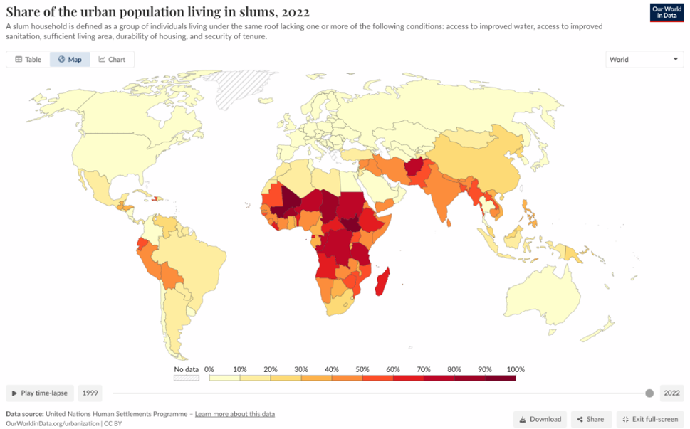 La première montre la répartition géographique des villes de plus de dix millions d'habitants, de plus d'un million, de plus de cinq cent mille et de plus de cinquante mille. La deuxième montre la part des populations urbaines vivant dans des bidonvilles (2022).