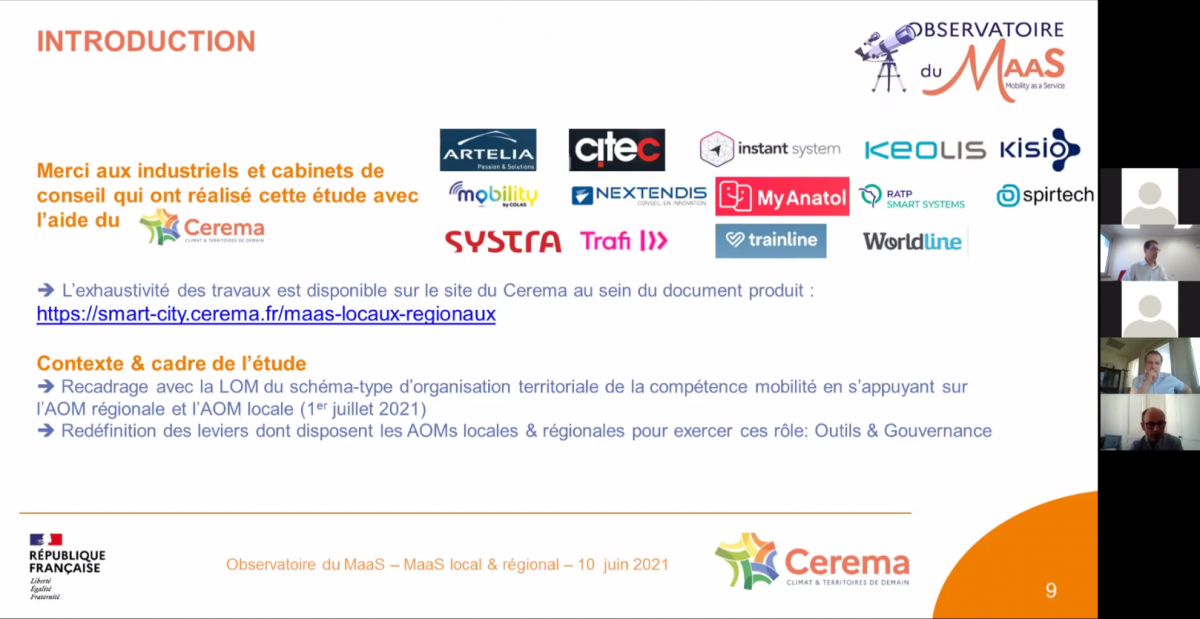 Laurent Chevereau, directeur d'études "MaaS" au Cerema Territoires et Ville, a ensuite présenté l'observatoire du MaaS. Initiée par le Cerema, cette démarche partenariale regroupe plusieurs acteurs nationaux, fédérant ainsi tous les acteurs du MaaS : Gart, Régions de France, UTP, FNTV, Alliance des mobilités, ADCET, Syntec Ingenierie et ATEC ITS, autour du ministère de la Transition Ecologique, qui oriente les actions de cet observatoire. Celles-ci consistent principalement en :