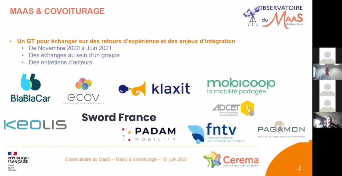Jean Robert (Cerema) a ensuite animé la séquence sur l'intégration du covoiturage dans les systèmes multimodaux, fruit du groupe de travail mobilisé depuis décembre 2020 et ayant produit un rapport complet sur ce sujet. Il a ainsi présenté les différents types d'intégration mis en oeuvre dans les territoires, et rappelé l'importance que ces intégrations soient au service des objectifs des politiques publiques.
