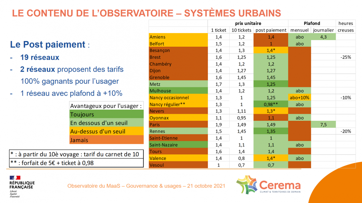 Laurent Chevereau a poursuivi en proposant un état des lieux du développement du MaaS en France, en se basant sur le contenu de l'observatoire du MaaS. Les caractéristiques fonctionnelles et les services de mobilité ont ainsi été analysés pour 90 services multimodaux : tous les systèmes régionaux, 50 systèmes urbains et 27 systèmes privés. Les services de micro-mobilité sont ainsi surtout présents sur les systèmes privés, tandis que les services de covoiturage urbain ou d’autopartage sont mieux intégrés dans les systèmes urbains. quant au mode ferroviaire, il est essentiellement présent sur les systèmes régionaux. Le post-paiement se développe, mais avec des modalités très différentes. Pour limiter les pertes de recettes, la plupart des réseaux ne proposent pas de solution "garantie du moins cher", mais certains profitent du post-paiement pour développer des tarifications incitatives, moins chères en heure creuse.