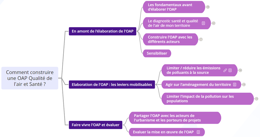 Une fois ces enjeux intégrés, les leviers actionnables dans une OAP et plus largement dans un PLU(i) sont présentés à travers trois grands items : agir sur les sources d’émission, réduire les émissions en lien avec l’organisation du territoire et réduire l’exposition des populations.