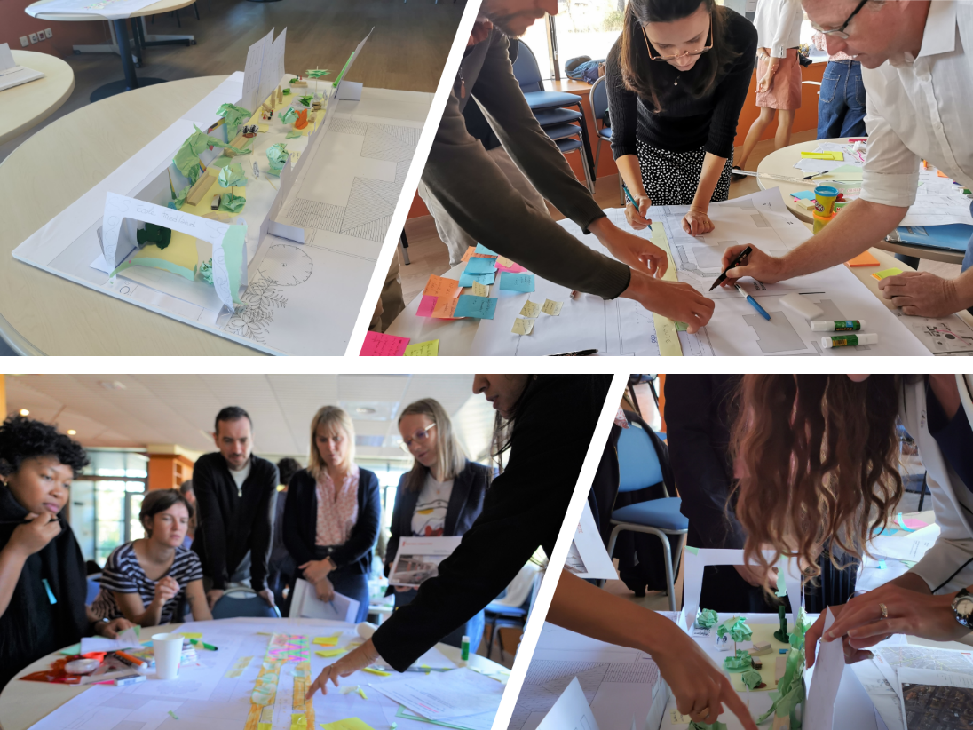 Après la sélection de trois cas représentatifs et l’orientation vers des scénarios déterminés, les scénarios de pacification ont été précisés dans le cadre d’un atelier de prototypage collaboratif (plans, maquettes, orientations pré-programmatiques) ayant réuni les équipes du Cerema avec plus une vingtaine d’experts de la ville intéressés par le sujet : agences d’urbanisme, CAUE, CPIE, bureaux d’étude paysage – VRD – sociologie urbaine, …