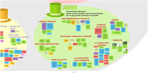 Puis un temps créatif et de partage d’idées (avec l'utilisation de méthodes d'intelligence collective et d'outils numériques, comme pour chaque atelier débat) a permis les échanges entre les participants avec la méthode des chapeaux de Bono autour de 4 questionnements sur la densité: