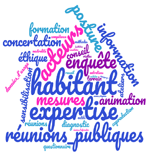 nuage de motsComme dans tous les domaines qu’il investit, le Cerema a à cœur de capitaliser les retours d’expériences pour partager les enseignements et méthodes, en constituant un socle de connaissances sur ses différentes thématiques. Cela lui permet de sensibiliser les élus et les services techniques sur les méthodes participatives. Il a par exemple produit avec des collectivités partenaires un livret sur la concertation avec les personnes handicapées, ou encore sur les démarches de développement de la nature en ville avec les citoyens.