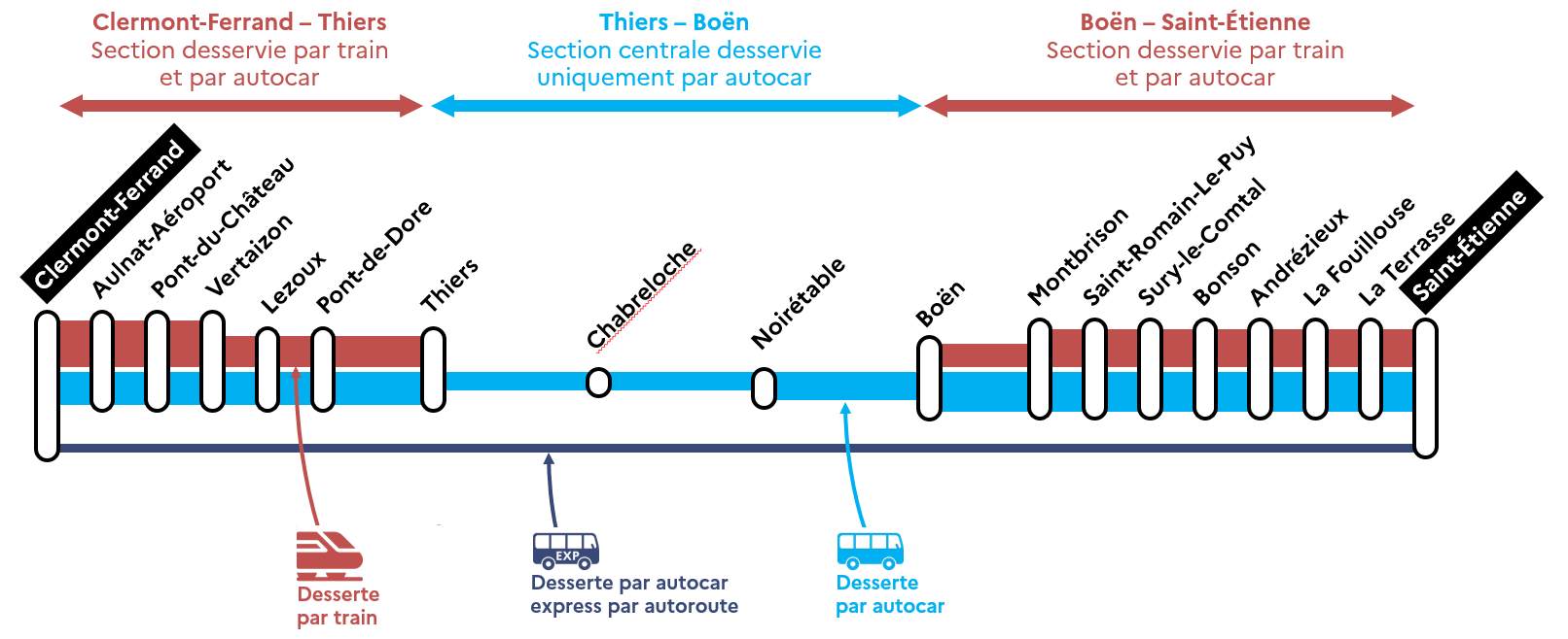 Le mauvais état de l'infrastructure a conduit à la suspension de toutes les circulations ferroviaires depuis l'été 2016 sur la partie centrale de la ligne, entre les gares de Thiers et de Boën. Seuls quelques services par autocar sont assurés pour desservir cette section, longue d’une cinquantaine de kilomètres.