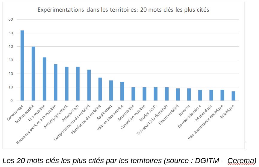La description des projets ou expérimentations de mobilité innovante portées par les collectivités territoriales s’appuie sur une liste de 140 mots clés de référence. Chaque fiche projet ou solution est « taguée » par (au moins) 3 mots clés. Le graphique ci-dessous illustre les 20 mots clés qui ont été le plus utilisés dans les présentations de projets, traduisant en filigrane quelles sont les problématiques les plus fréquemment rencontrées, et les solutions les plus plébiscitées pour y remédier.