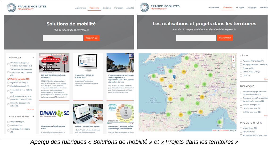 Quelques mois après son lancement, la plateforme recense déjà près de 500 solutions ou services de mobilité, environ 170 projets innovants expérimentés (ou en cours de développement) dans les territoires, et identifie plus de 530 acteurs du secteur (collectivités, entreprises, start-up, associations, opérateurs, organismes techniques, etc.).