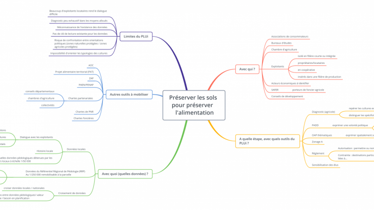 Les participants ont ensuite travaillé sur les éléments permettant la préservation de certaines de ces fonctions tels que l’alimentation, l’habitat pour la biodiversité des sols, le support de vie humaine, dans les PLUi. La carte mentale suivante est un exemple de résultat obtenu dans cette séquence et là encore ne montre pas l'exhaustivité des possibilités offertes dans la démarche de documents d'urbanisme tels que les PLUi pour favoriser la fonction traitée (en l'occurrence, l'alimentation).