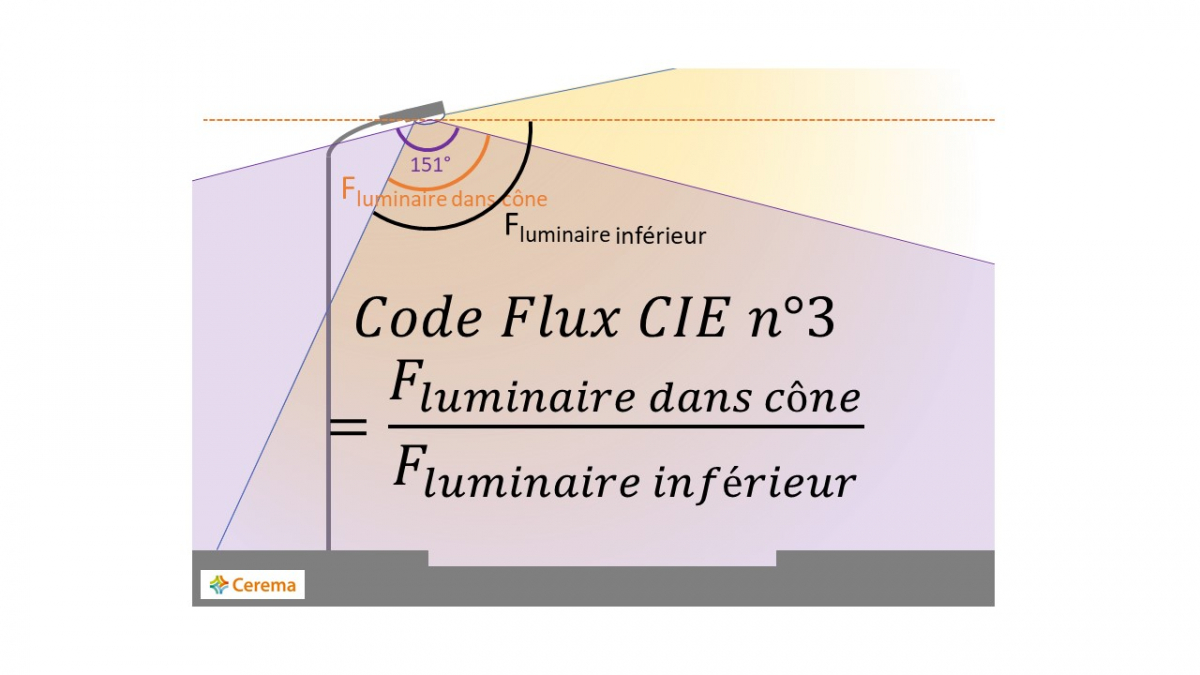 Le code de flux CIE n°3 représente la proportion de flux lumineux émis dans l'hémisphère inférieur dans un angle solide de 3π/2 stéradian (angle solide équivalent à un cône de demi-angle 75,5° soit un angle total de 151°) par rapport au flux lumineux émis dans tout l'hémisphère inférieur.