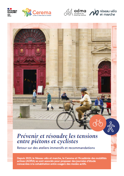 C’est pour aider les territoires à mieux comprendre ces situations et à y apporter des réponses durables que, l’Académie des mobilités actives (ADMA), le Cerema et le Réseau vélo et marche publient aujourd’hui le livret "Prévenir et résoudre les tensions entre piétons et cyclistes". Ce document synthétise les enseignements d’une large démarche menée en 2023–2024 dans le cadre de journées d’étude mêlant ateliers immersifs et visites de terrain, dans plusieurs villes françaises : Bordeaux, Clermont-Ferrand, La Rochelle, Lille et Montpellier.