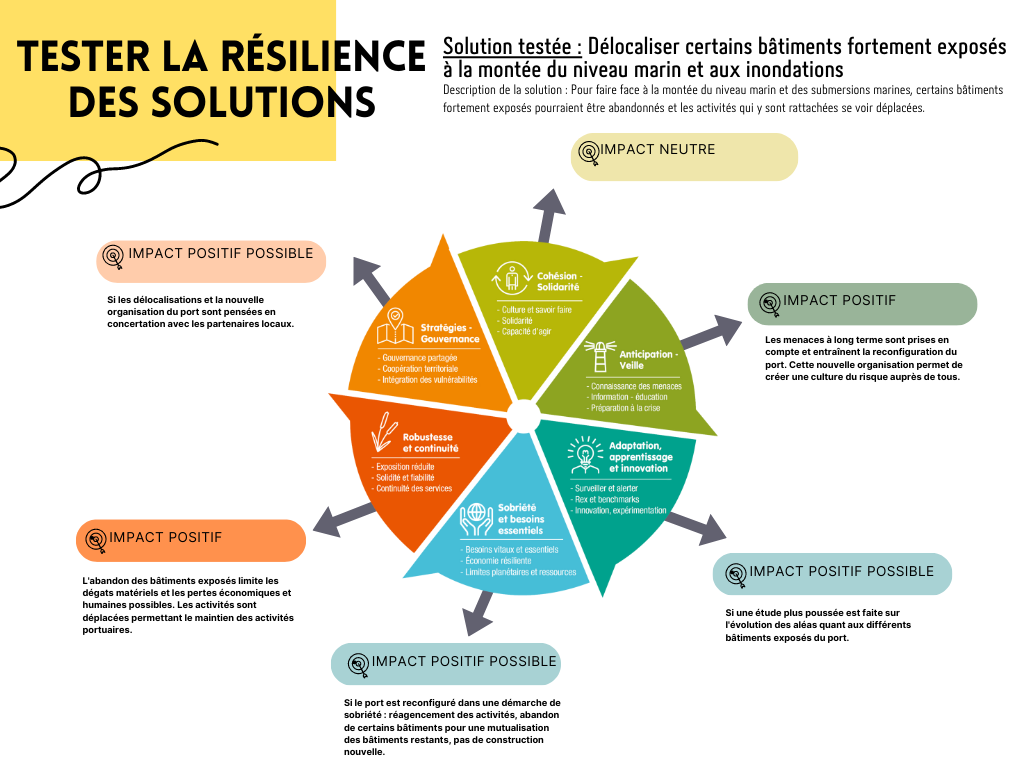 La dernière phase pour passer au plan d’action se base sur un classement de ces solutions. Pour cela, deux méthodes ont été expérimentées et mises en complémentarité. Une première, classique, basée sur une analyse multi-critères prenant notamment en compte la faisabilité financière et technique des mesures ou la facilité de mise en œuvre ou d’exploitation. La deuxième, plus innovante, se base sur la résilience. S’appuyant sur une méthode et un outil (la boussole de la résilience), élaborés par le Cerema, il s’agit de tester la résilience des solutions d’adaptation proposées. Par ailleurs, l’outil peut aussi servir pour l’amélioration des actions, comme cela a été expérimenté lors d’un atelier.
