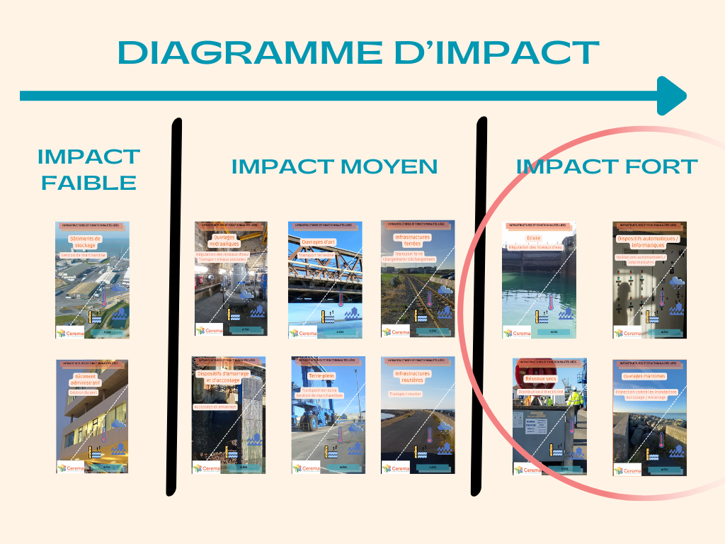 Ensuite le Cerema a analysé les sensibilités des infrastructures et fonctionnalités du port vis-à-vis de ces variables climatiques et détaillé leurs vulnérabilités futures au regard de différents scénarios climatiques et horizons temporels. Ainsi la méthodologie appliquée au port de La Rochelle a permis de mettre en exergue différentes familles d’infrastructures et de fonctionnalités qui seront soumises à un risque plus important de détérioration et/ou de destruction (pour les infrastructures) et de dégradation, voire d’arrêt (pour les fonctionnalités).