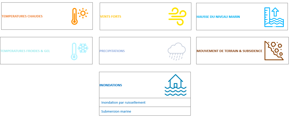 Le premier travail mené constitue un repérage des aléas climatiques ou naturels dont les évolutions liées au changement climatique peuvent avoir un impact direct ou indirect sur le port Atlantique de La Rochelle.