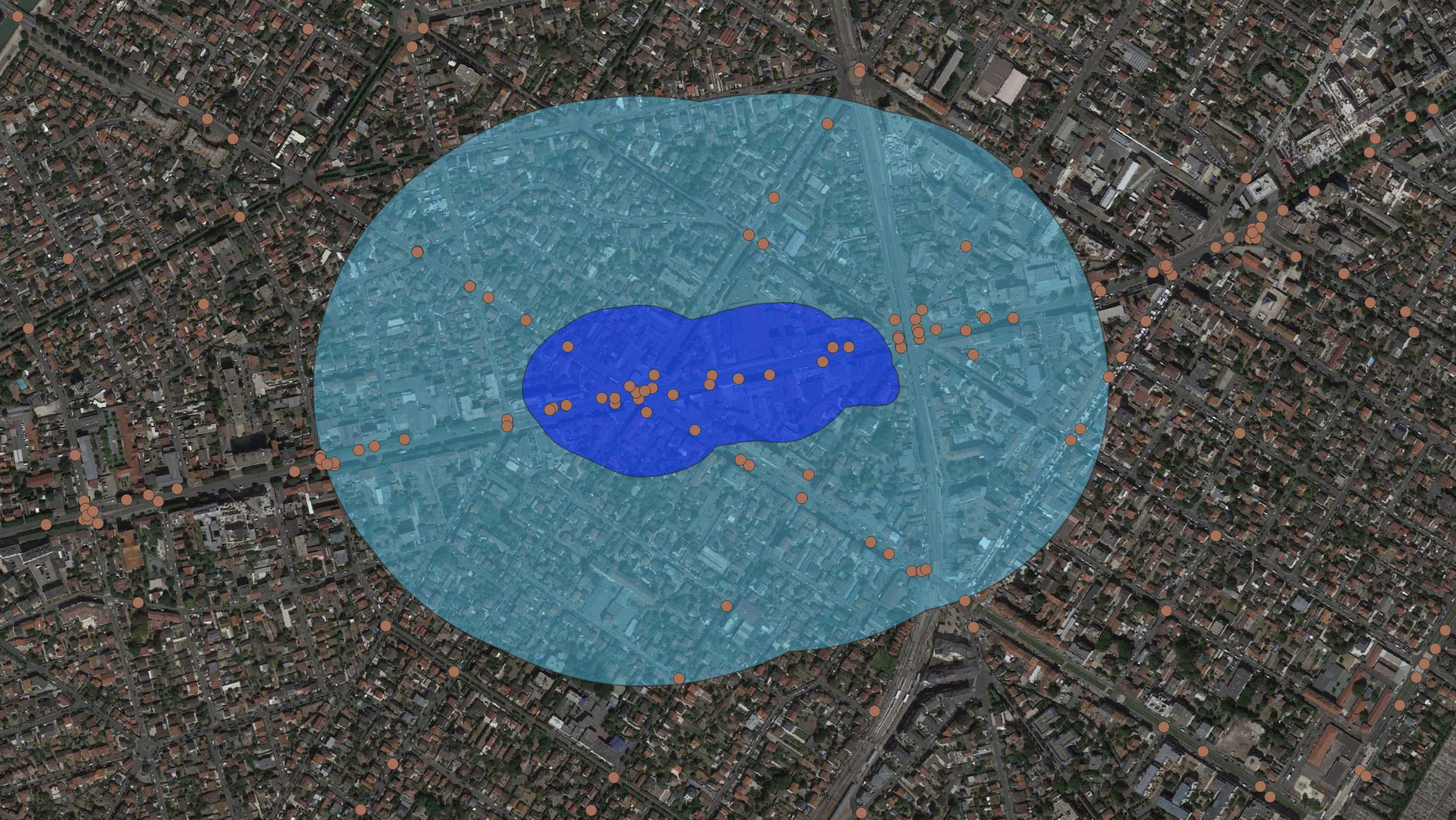 Selon les premiers résultats et observations, le chargé d’études sélectionne un rayon de lissage pour l’étude ainsi qu’un seuil de densité, définissant ainsi les LCA.