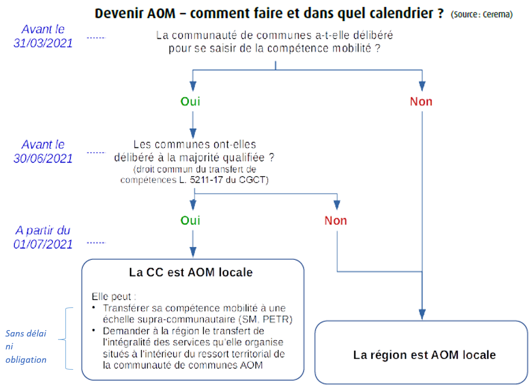 - Jusqu’au 31 mars 2021, les communautés de communes souhaitant prendre la compétence AOM devaient se prononcer par délibération.