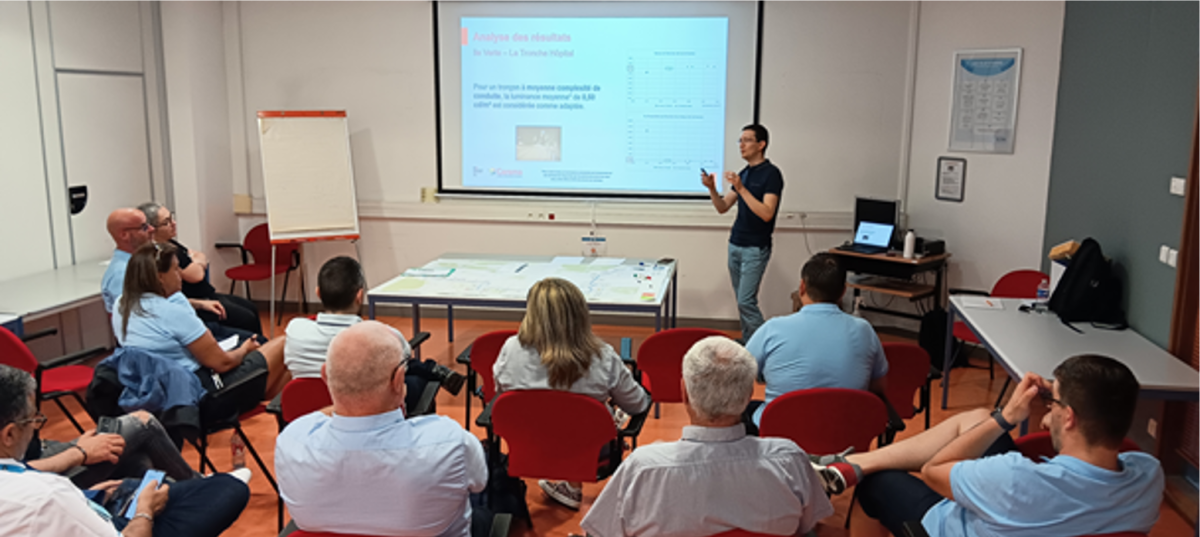 Les conclusions de l’étude précédente ont abouti à une possibilité de compromis entre la volonté des communes de réduire le niveau de luminosité d’éclairage public à partir de certaines heures, et la garantie d’un niveau suffisant pour une conduite sécurisée sur plateforme de tramway. Une seconde étude (2024-2025) a développé une méthodologie d’attribution de seuil de luminance minimal pour chacune des interstations du réseau de tramway. Cette démarche a été construite par analogie avec la norme NF EN 13201 de dimensionnement d’installations d’éclairage public, puis adaptée sur la base d’ateliers participatifs avec des conducteurs de tramway. Elle a abouti à une restitution du SDE sous la forme d’une base de données intégrable dans un système d’information géographique (SIG).