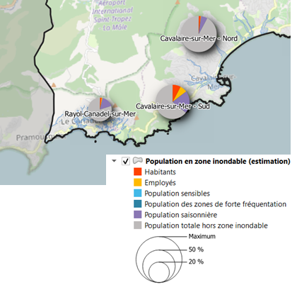 Les représentations cartographiques de ces indicateurs s’adaptent en temps réel au niveau de zoom choisi par l’utilisateur dans QGis : à de larges échelles, les valeurs d’indicateurs vont être agglomérées au niveau de l’EPCI tandis qu’à de plus fines échelles, tous les bâtiments concernés vont être représentés. AgiRisk considère différentes échelles de représentation tout en respectant la confidentialité requise par le secret statistique.