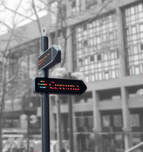enfin, l'information digitalisée prend de plus en plus de place dans l'espace public : la Métropole de Lyon teste par exemple des panneaux de signalisation dynamique avec le dispositif iGirouette (photo ci-dessous).