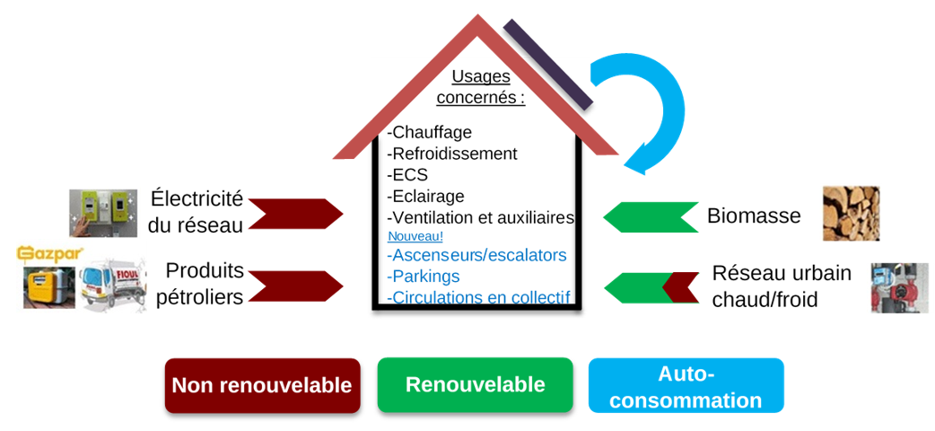 Sur l’ensemble des vecteurs énergétiques utilisés pour couvrir les besoins de ces postes de consommations la partie renouvelable et non renouvelable est comptabilisée. Le calcul du Cep comptabilise uniquement les énergies importées (renouvelables ou pas) nécessaires à la couverture des besoins du bâtiment. L’indicateur ne comptabilise donc pas les énergies renouvelables captées sur la parcelle du bâtiment.