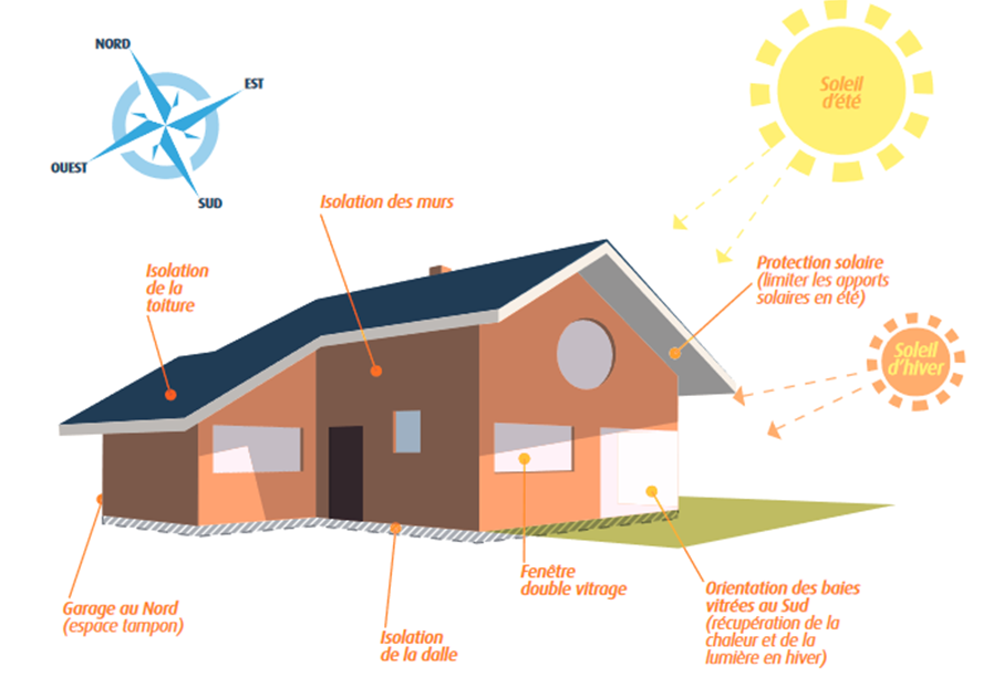 Le premier levier à mettre en œuvre correspond à une bonne conception bioclimatique prenant en compte le contexte géographique et le contexte architectural.