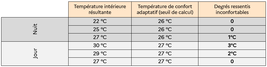 La RE2020 module ainsi le seuil de calcul pour la journée, le seuil de calcul pour la nuit n’est jamais modulé et toujours égal à 26°C (le phénomène d’adaptation n’a pas lieu la nuit).