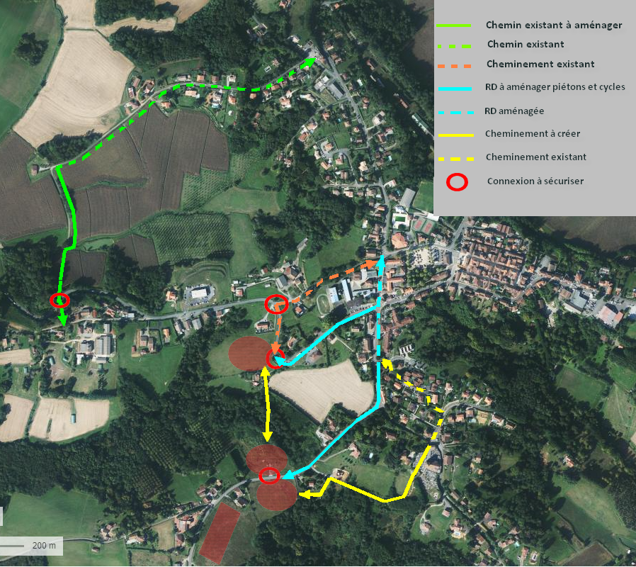 2/ Après la validation de ce diagnostic par la commune, 10 fiches actions ont été proposées pour permettre d’apaiser le centre bourg, mettre en valeur le patrimoine touristique, sécuriser les abords des écoles et du collège mais aussi pour favoriser la marche et le vélo sur toute la zone habitée de la commune. Une action permet d’intégrer, à la réflexion globale, les futures zones d’habitation prévues au PLU afin de prévoir leur connexion directe au centre bourg par les modes actifs (marche et vélo).