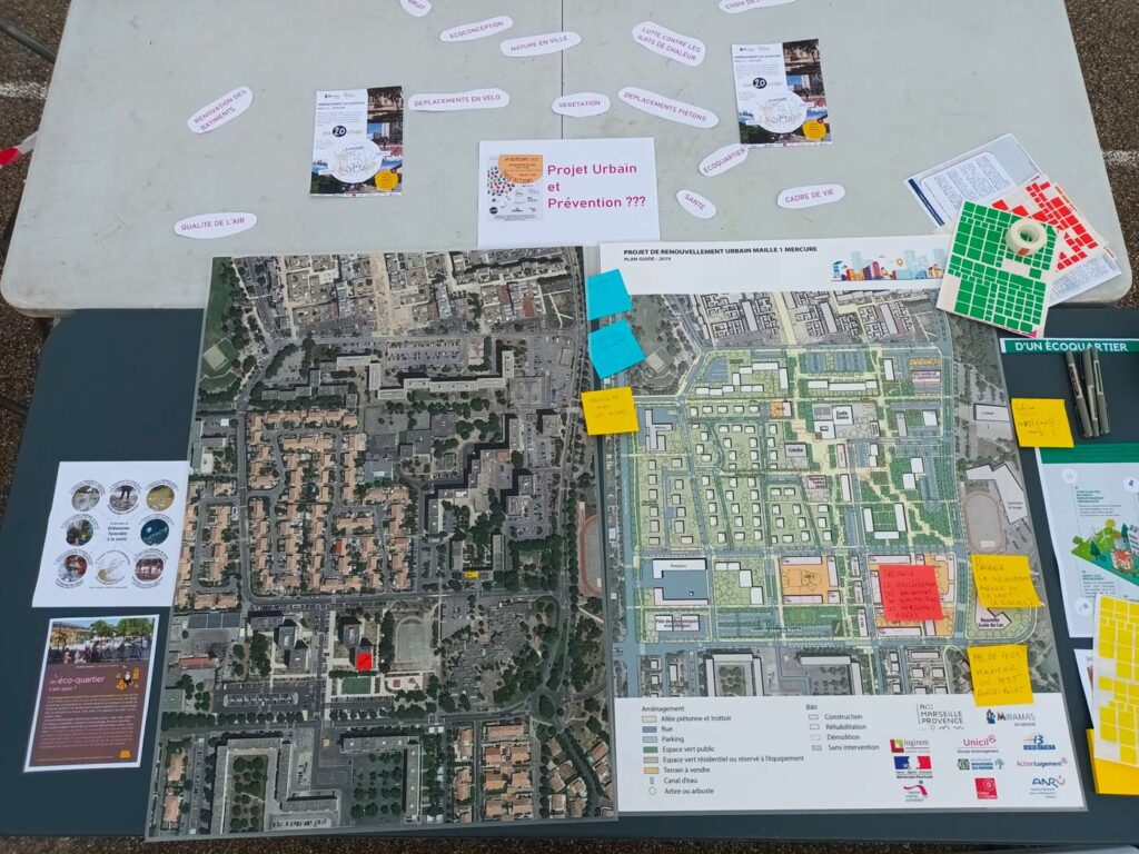 - la création d'une démarche collective pour un projet de rénovation d'un quartier, avec des cafés-chantier, du porte-à-porte, des ateliers notamment sur l'école sur quartier (démarche menée à Miramas),