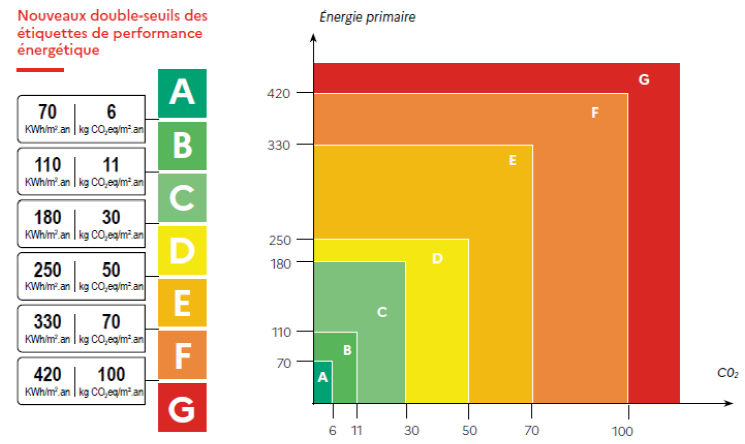 Le DPE affiche d’un double seuil Énergie / Carbone. En plus du niveau de performance pour l’énergie, qui donne de la visibilité sur la consommation du logement il informe sur ses rejets de gaz à effet de serre (CO2) dans l’atmosphère (voir illustration ci-dessous).