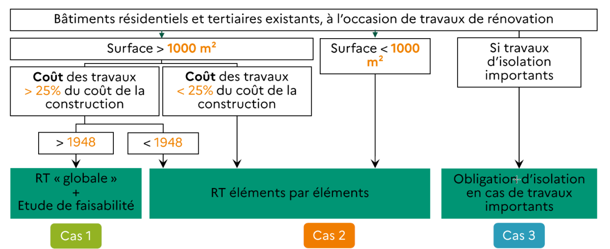 Le programme de travaux de rénovation énergétique doit aussi prendre en considération le respect de la réglementation thermique. Pour les travaux de rénovations des logements c’est la réglementation thermique pour les bâtiments existants (RT Existant) dans le code de la construction et de l'habitat qui s’applique de 3 manières différentes : RT global , RT éléments par éléments et "décret travaux embarqués"