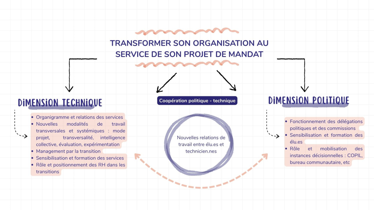 Cet axe peut se traduire par la mise en place d’équipes projets mixtes, de séminaires politiques-techniques ou de parcours d’acculturation partagés autour des enjeux de transition et de prospective territoriale.