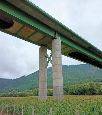 Le Cerema a développé le premier pont routier à double action mixte pour la réalisation du viaduc du contournement de Mende, qui permet, au droit des appuis, de mieux répartir l’effort entre les matériaux acier et béton grâce à un hourdis inférieur en béton encaissant l’effort de compression.