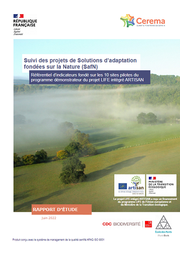 Marylou Dufournet du Cerema a rappelé tout l’intérêt de suivre et rendre compte de l’efficacité de ce type d’actions. Puis, elle a présenté la méthodologie de co-construction qui a permis d’aboutir au référentiel de suivi des Solutions d’adaptation fondées sur la Nature des sites pilotes du projet Life Artisan (téléchargeable sur l'article en lien ci-dessous).