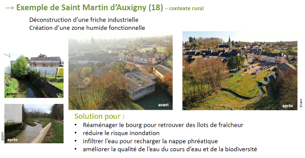Puis, Clémentine Duvigneau du Cerema Ile-de-France détaille une méthode de repérage du potentiel de renaturation à large échelle appliquée lors d’un accompagnement de l’EPCI Vallée Sud – Grand Paris et de la commune de Ris-Orangis. Pascale Larmande de l'Agence Régional de la Biodiversité (ARB) a ensuite présenté les accompagnements menés par l’ARB sur le sujet de la renaturation, dont l’action du réseau Territoires Engagés pour la Nature (TEN). Sont ainsi exposés la réhabilitation d’une friche, la création d’une zone humide servant de zone d’expansion de crue à Saint-Martin d’Auxigny (Cher) et la désimperméabilisation d’un parking pour créer un bosquet urbain à Saint-Cyr-sur-Loire (Indre-et-Loire).