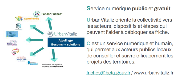 Il est fréquent qu’une collectivité se sente démunie face à un verrou l’empêchant d’envisager un projet sur une friche, ne sachant comment engager la réflexion ou lui faire franchir une étape face à un obstacle jugé insurmontable. UrbanVitaliz, c’est un service numérique public et gratuit qui permet d’orienter ces collectivités vers les acteurs, dispositifs et étapes qui sont susceptibles de débloquer la situation. L’équipe d’Urbanvitaliz accompagnée de différents partenaires locaux comme les DDT, les CAUE, les EPF, les agences d’urbanisme aiguillent et accompagnent les différentes démarches grâce à un parcours de suivi du site où les informations, expertises, conseils sont capitalisées.