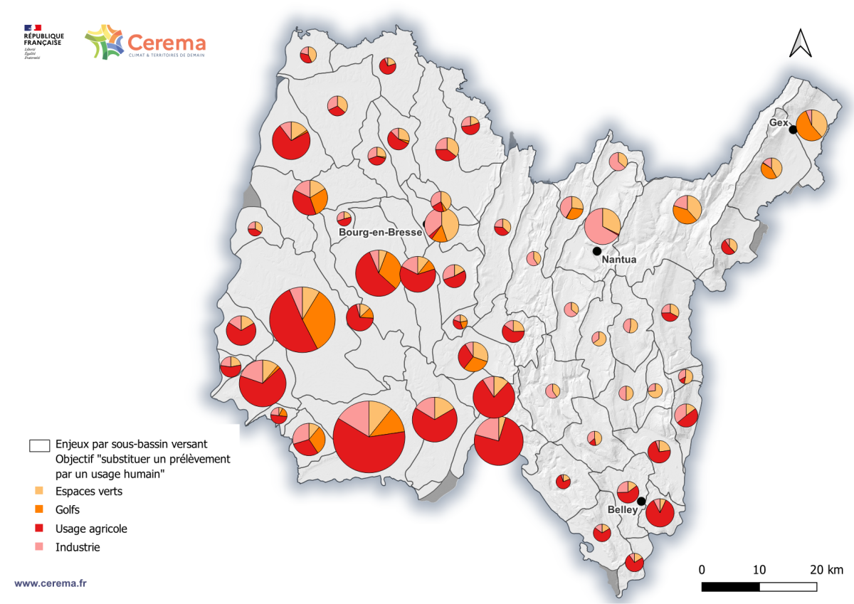 Il y a une vulnérabilité quant à la disponibilité en eau pour les nappes des Cailloutis de la Dombes et des alluvions de la plaine de l’Ain ainsi que sur certains cours d’eau (Reyssouze, Veyle, Ain pour les principaux) : si la REUT se substitue à des prélèvements existants, alors elle peut être particulièrement opportune sur ces secteurs.
