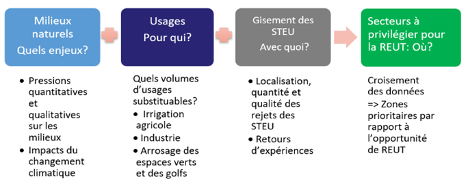 L’étude d’opportunité apparaît alors comme un outil d’aide à la décision partagé par l’ensemble des acteurs concernés. Elle permet d’identifier les usages les plus propices et les bassins versants pour lesquels il y aurait un intérêt à inciter ou au contraire à freiner les projets de REUT.
