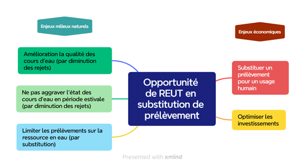 En effet, dans un contexte de tensions sur la ressource en eau, la REUT représente une solution pour préserver la ressource et s’adapter au changement climatique, si elle s’envisage dans une logique de substitution à un prélèvement déjà existant, et en tenant compte des enjeux du territoire.
