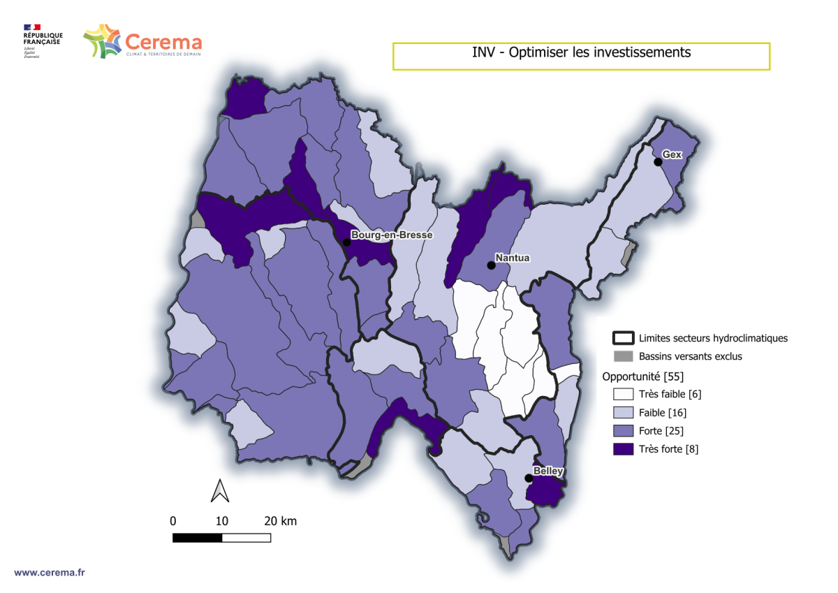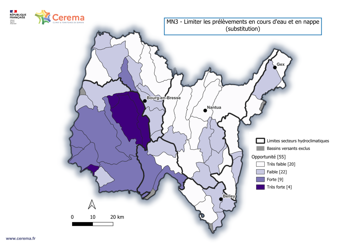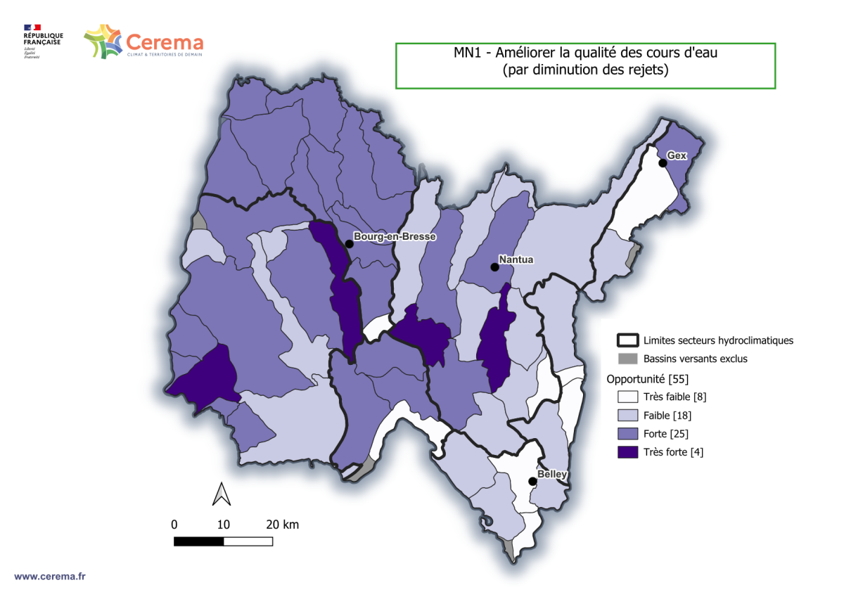 L’opportunité a été évaluée au regard des 5 objectifs suivants pour chacun des 55 sous-bassins versants et en fonction de deux saisons (période estivale d’avril à septembre et hors période estivale d’octobre à mars). Il faut cependant garder à l’esprit que l’échelle de ce travail masque les disparités locales: