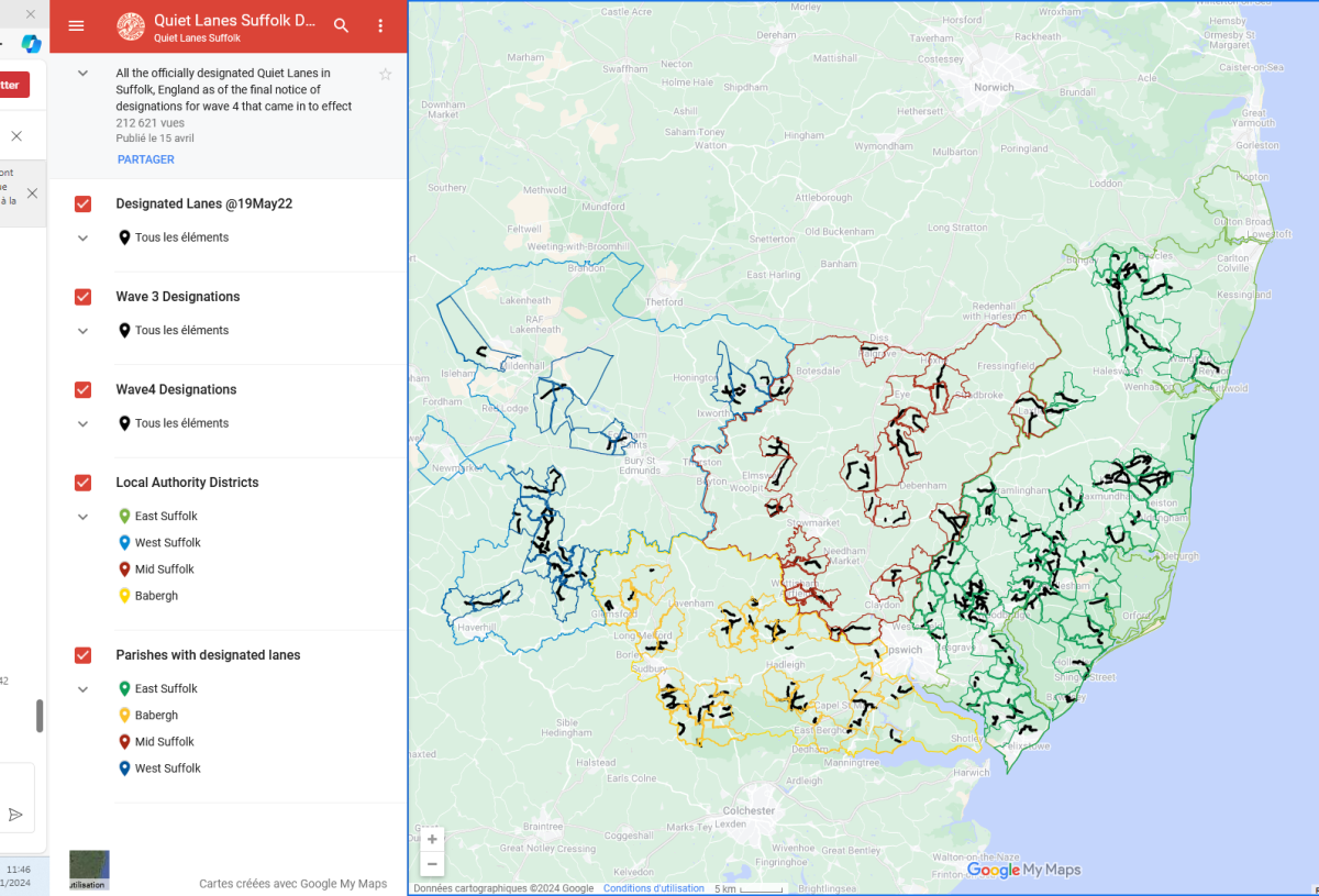 Ensemble des routes tranquilles dans le Suffolk (Source : Quiet Lanes Suffolk Designations @11Feb2023 – Google My Maps)