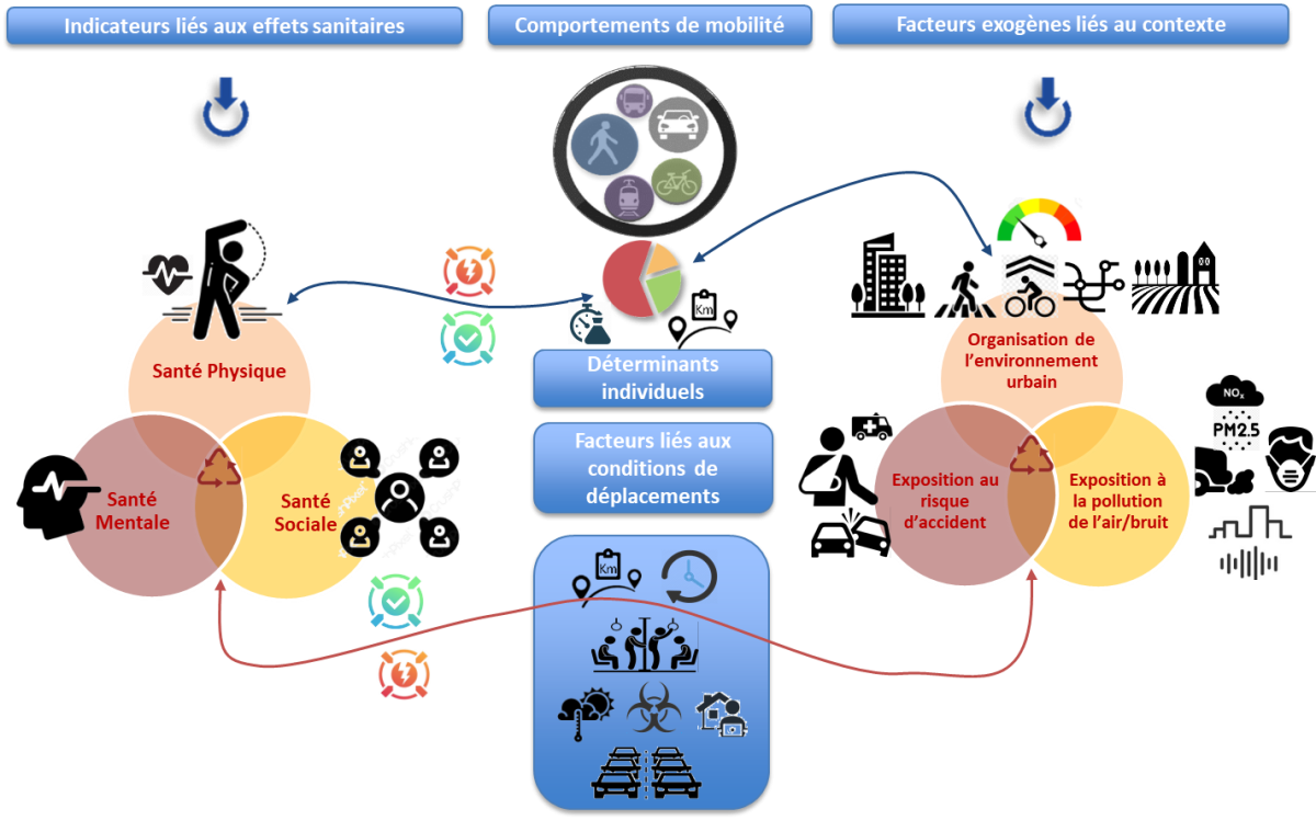 La mobilité quotidienne cristallise une grande partie des enjeux liés aux interactions entre santé et mobilité : d’un côté elle apporte des bienfaits réguliers sur la santé physique des personnes, surtout si elles se déplacent à pied ou à vélo, mais de l’autre se déplacer quotidiennement expose aussi de manière répétée à différents risques (accident, pollution, stress etc.). Dès lors, les politiques de mobilité doivent tenir compte de ces enjeux sanitaires pour la population, en comprendre les leviers d’action et contribuer à la réduction des inégalités, dont une partie sont liées à la mobilité.