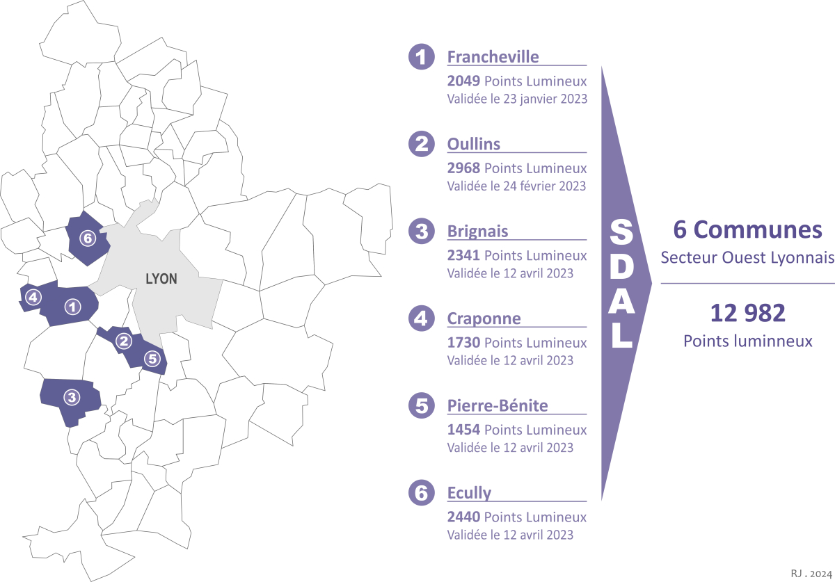 Dans le cadre de la convention de coopération, le SIGERLy a confié au Cerema (Direction Territoriale Centre-Est) la réalisation de schémas directeurs d'aménagement lumière pour le compte de 6 communes situées au Sud-Ouest de la Métropole de Lyon : Francheville, Craponne, Pierre-Bénite, Oullins, Ecully et Brignais. Ce qui représente un total de 13 000 points lumineux à traiter répartis sur un territoire de 40 km².