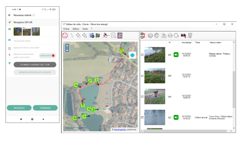 L'éditeur de visites fourni avec SCOUT permet de récupérer les visites de terrain SCOUT et de les exploiter : affichage cartographique, modifications, ajout de relevés virtuels, intégration d'images et vidéos, génération de rapports, export vers SIG...