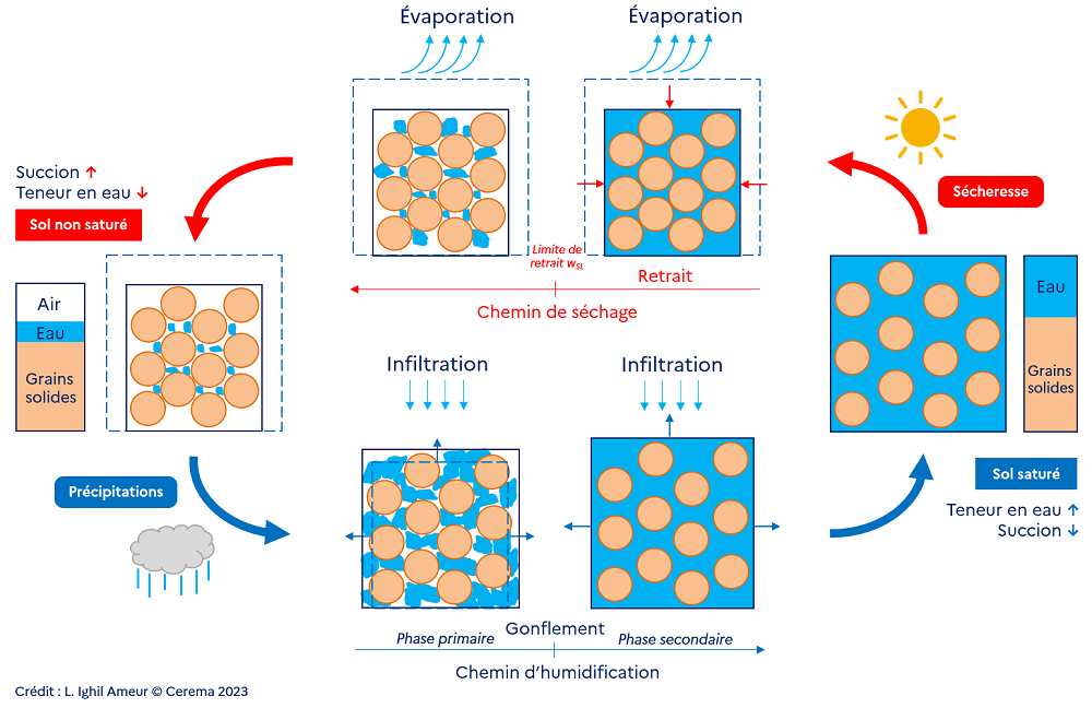 Un élément de sol saturé soumis dans un premier temps à un chemin de séchage (sécheresse) enregistre à la fois une déformation volumique dans le sens du retrait et une perte de masse liée à l’évaporation de l’eau présente dans le sol. Cette première phase dite de "retrait" est caractérisée par le rapprochement des grains solides et se poursuit jusqu’à la limite de retrait, à partir de laquelle le séchage se poursuit via l’évaporation. Sur ce chemin de séchage, la teneur en eau du sol diminue et inversement, la succion augmente et le sol devient non saturé à l’état final.