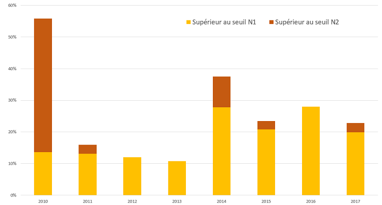 Pour la région Normandie, les analyses physico-chimiques classent la majorité des sédiments dragués (65% à 85%) en dessous du seuil N1 (Figure 3). En d’autres termes, la plus grande partie des sédiments dragués est clapée en mer sans difficulté. Dans le cas où la qualité physico-chimique et/ou l’opération de dragage ne permet pas un clapage, la gestion à terre est envisageable.