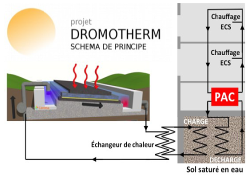 Le concept développé dans le cadre du projet Dromotherm cherche à valoriser en milieu urbain le potentiel énergétique des voiries en récupérant la chaleur captée par les chaussées lors des périodes estivales, en la stockant dans le sol à la base des bâtiments, et en subvenant aux besoins de chauffage de ces derniers lors des périodes hivernales.