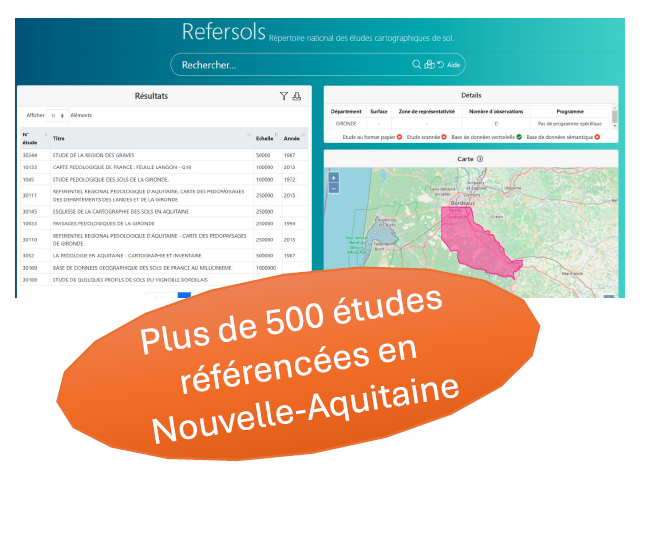 Le Gis Sol met également à disposition un outil de recherche, Refersols, pour accéder aux études pédologiques existantes, ainsi qu'un dataverse ou entrepôt de données contenant 38 jeux de données.
