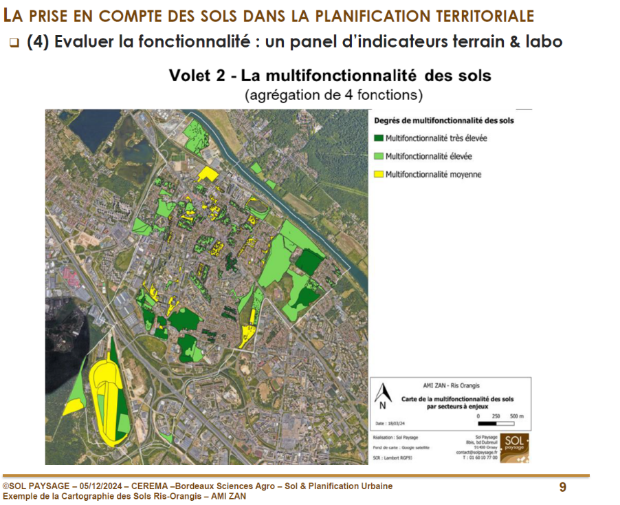 Une étude de terrain menée à Ris-Orangis a permis de réaliser une cartographie détaillée des sols urbains, mettant en évidence des sols non imperméabilisés et parfois non modifiés par l'homme, ce qui va à l'encontre de la vision classique des sols urbains comme entièrement anthropisés (voir cartographie dans la présentation). Cette évaluation des fonctionnalités des sols a aidé à orienter les choix d’aménagement, notamment en soulignant la présence de sols multifonctionnels, comme ceux proches des stations de transport en commun.