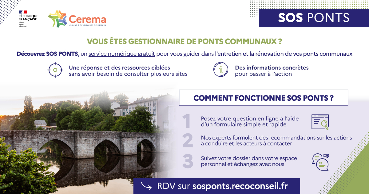 Ces communes ont besoin d’être accompagnées pour mener les opérations d’entretien et de réparation de leurs ponts et leurs murs. SOS ponts a donc été mis en place par le Cerema, avec un soutien financier de la Direction Interministérielle du Numérique [voir encadré en fin d'article], pour répondre aux questions des collectivités : Mon pont est abimé, qu’est-ce qu’il faut faire pour le remettre en état ? Comment s’y prendre pour les réparations ? Qui contacter ? et quelles sont les aides disponibles ?