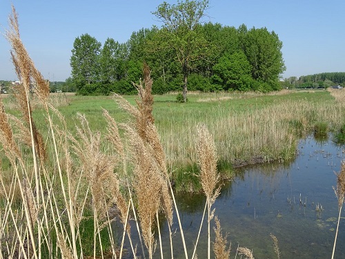 Vue de roseaux et d'une prairie en bordure de la Bourbre